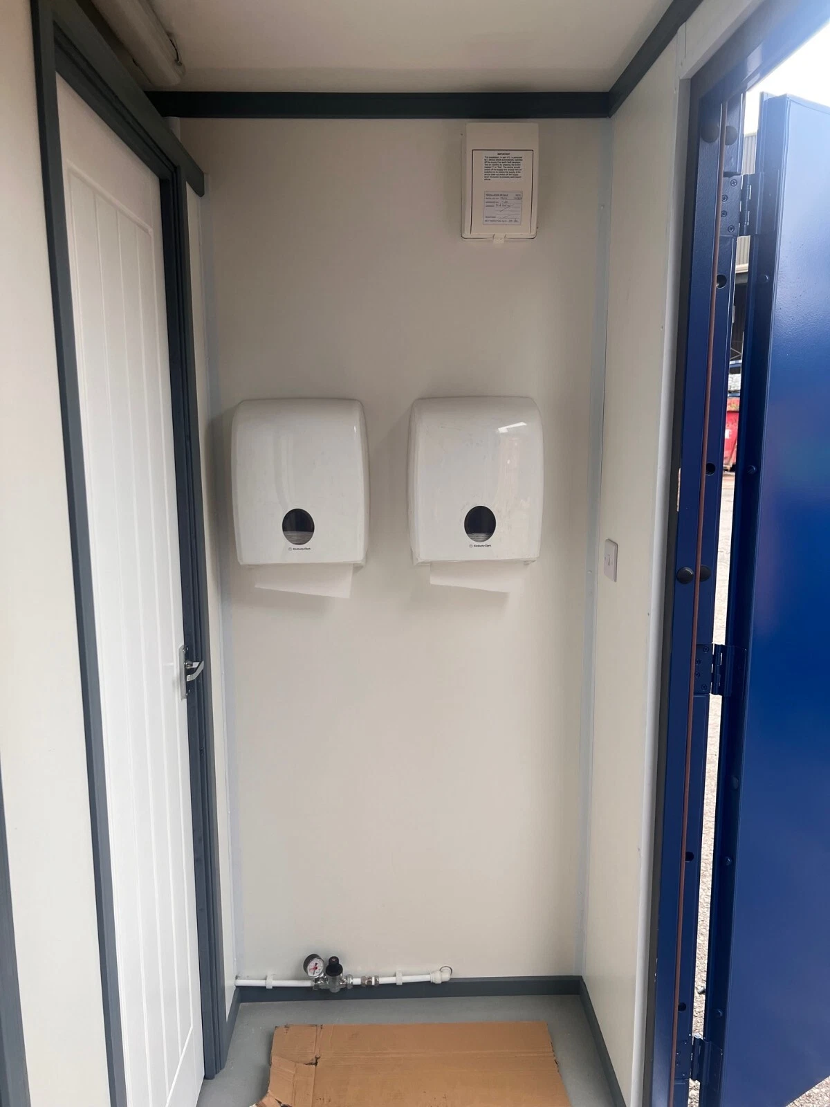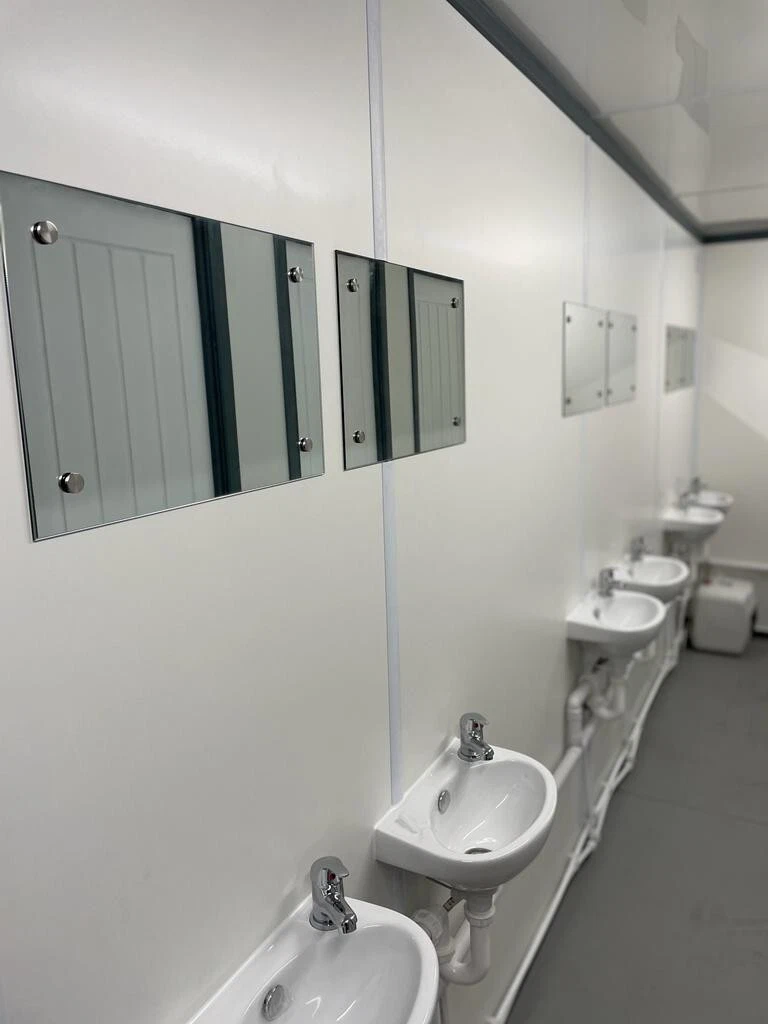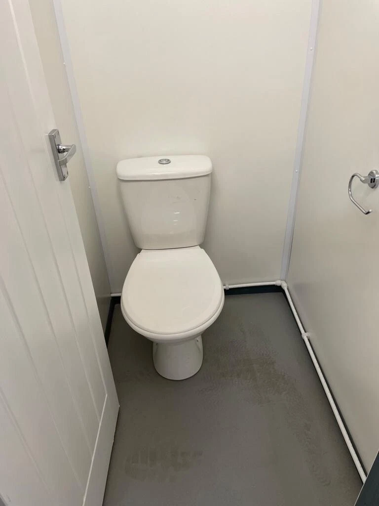Plumbing is pre-installed within the unit’s floor void, with main supply and waste connections located externally via standardized coupling points for quick setup on-site. The sanitaryware selected is standard commercial-grade ceramic, chosen for durability and ease of replacement . The electrical system is run in protective conduit and terminates in a single external connection box, simplifying hookup to a site generator or mains power supply.