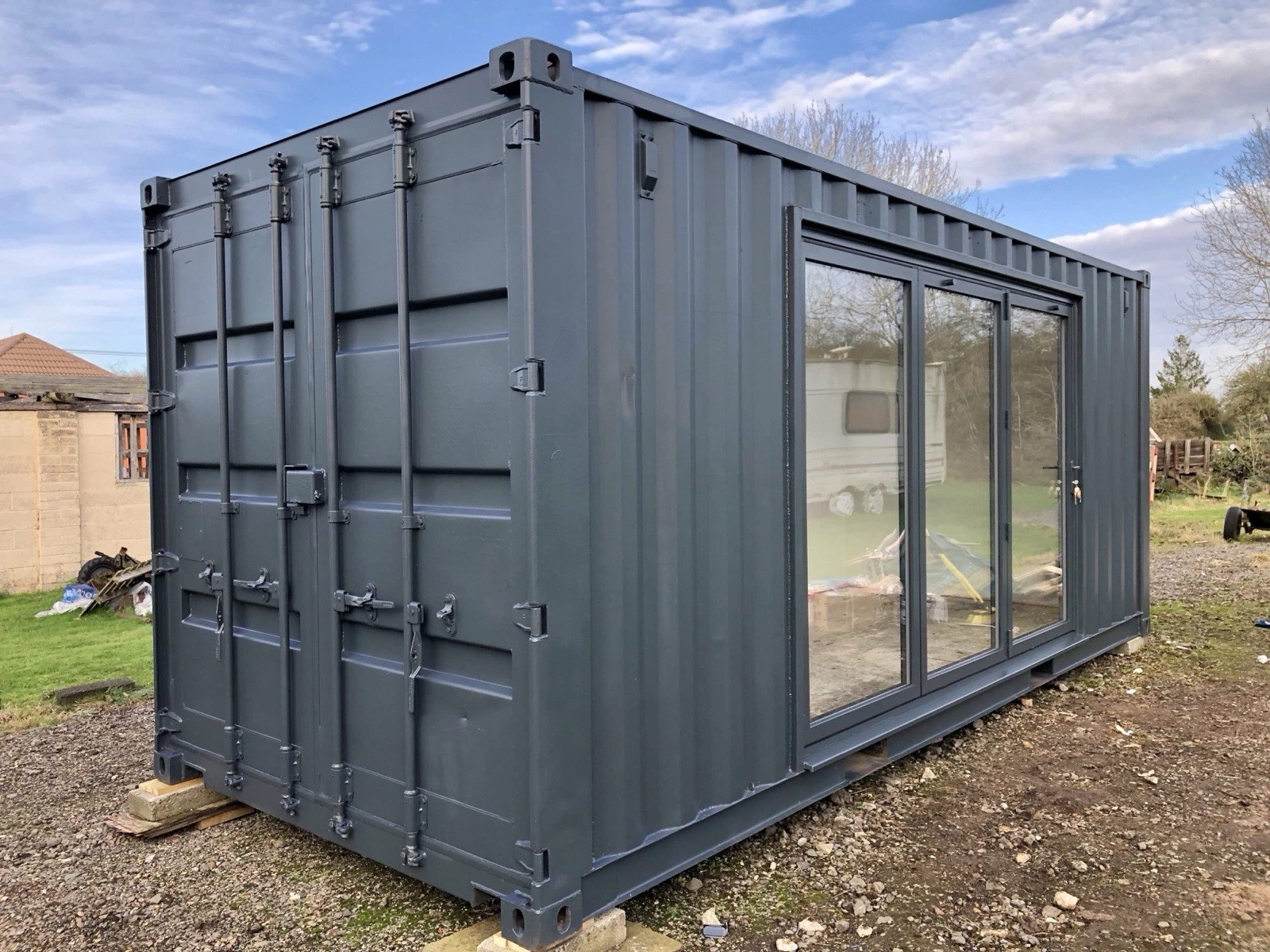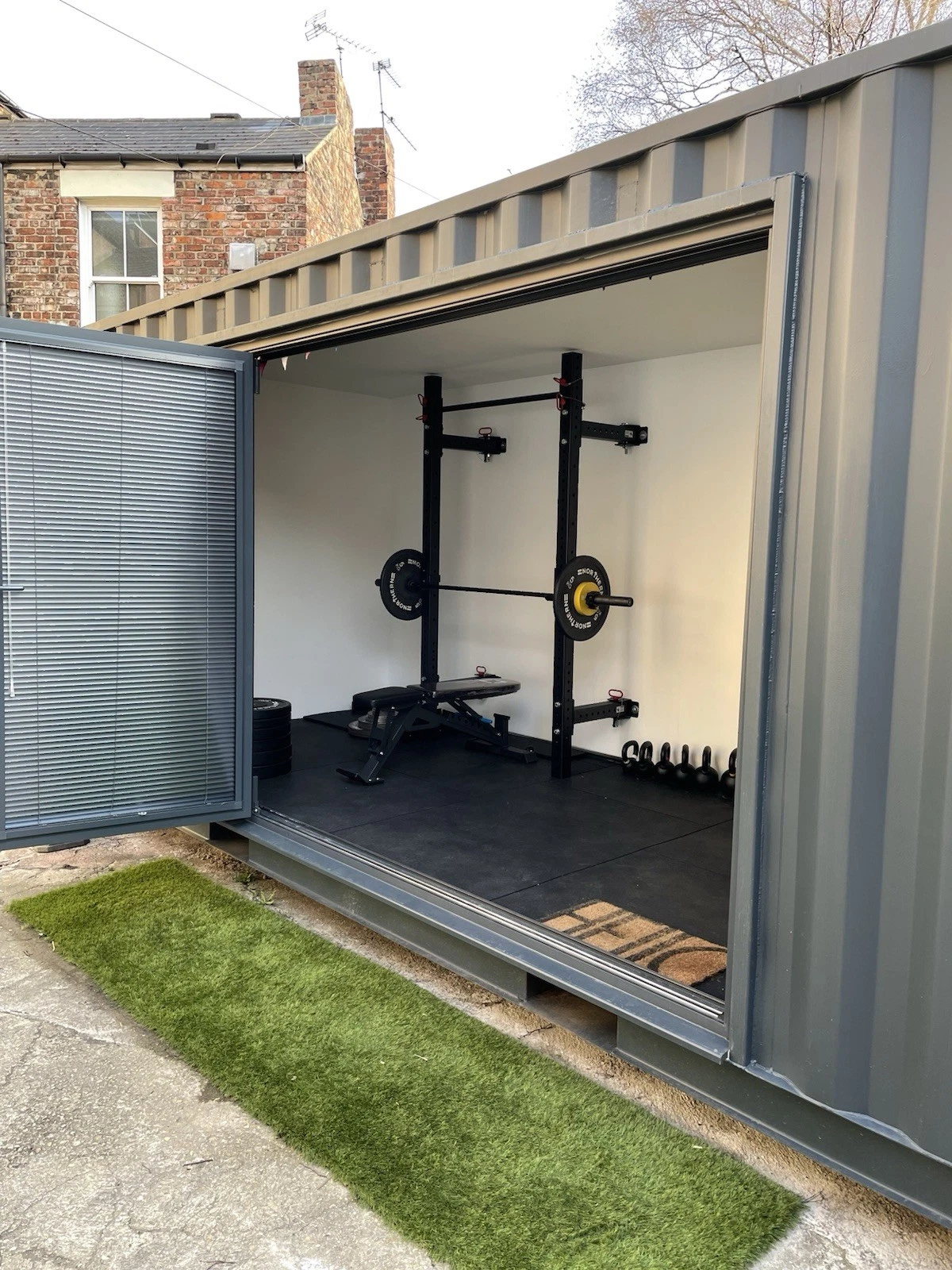 This 20-foot converted shipping container provides a durable and functional space, suitable for use as a private fitness studio or a compact office. Constructured from a repurposed high-tensile steel container, this unit is designed for longevity and can be placed in various outdoor environments. It offers a practical alternative to traditional construction, serving as a dedicated space that is separate from the main residence or business premises. The structure is delivered ready for use, requiring only placement on a level surface .