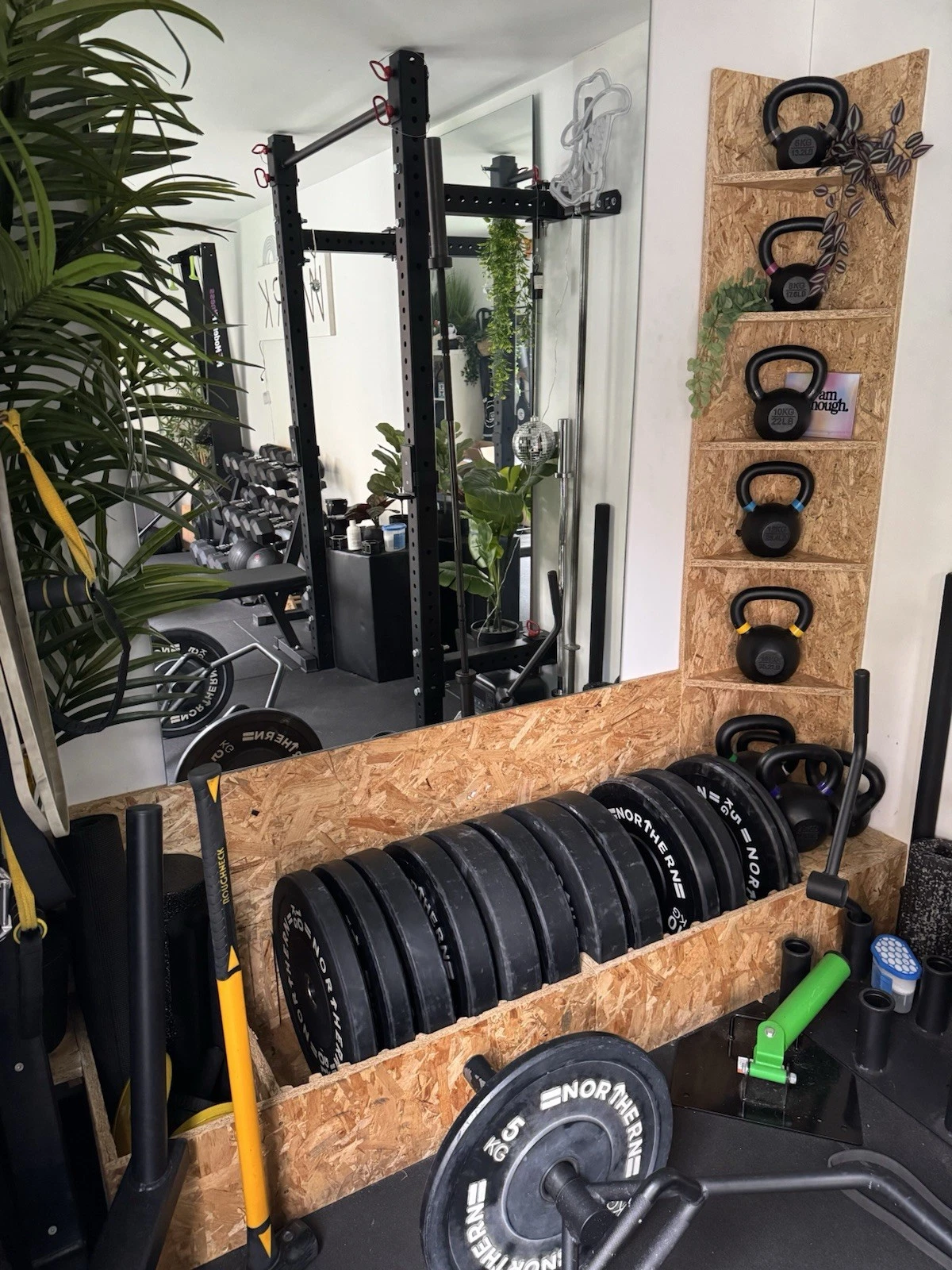 The electrical system is installed to support modern usage. This includes integrated LED light fixtures for even illumination and several standard electrical outlets, providing the necessary power for computers, monitors, gym equipment, or small appliances . The flooring consists of a durable, plywood base suitable for the installation of rubber gym matting, vinyl flooring, or carpet tiles, depending on the intended application .